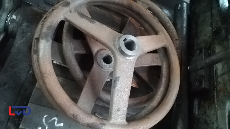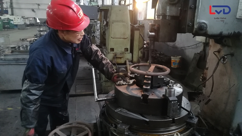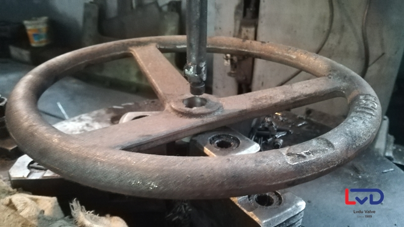 實拍雙偏心法蘭蝶閥鐵手輪孔加工現(xiàn)場